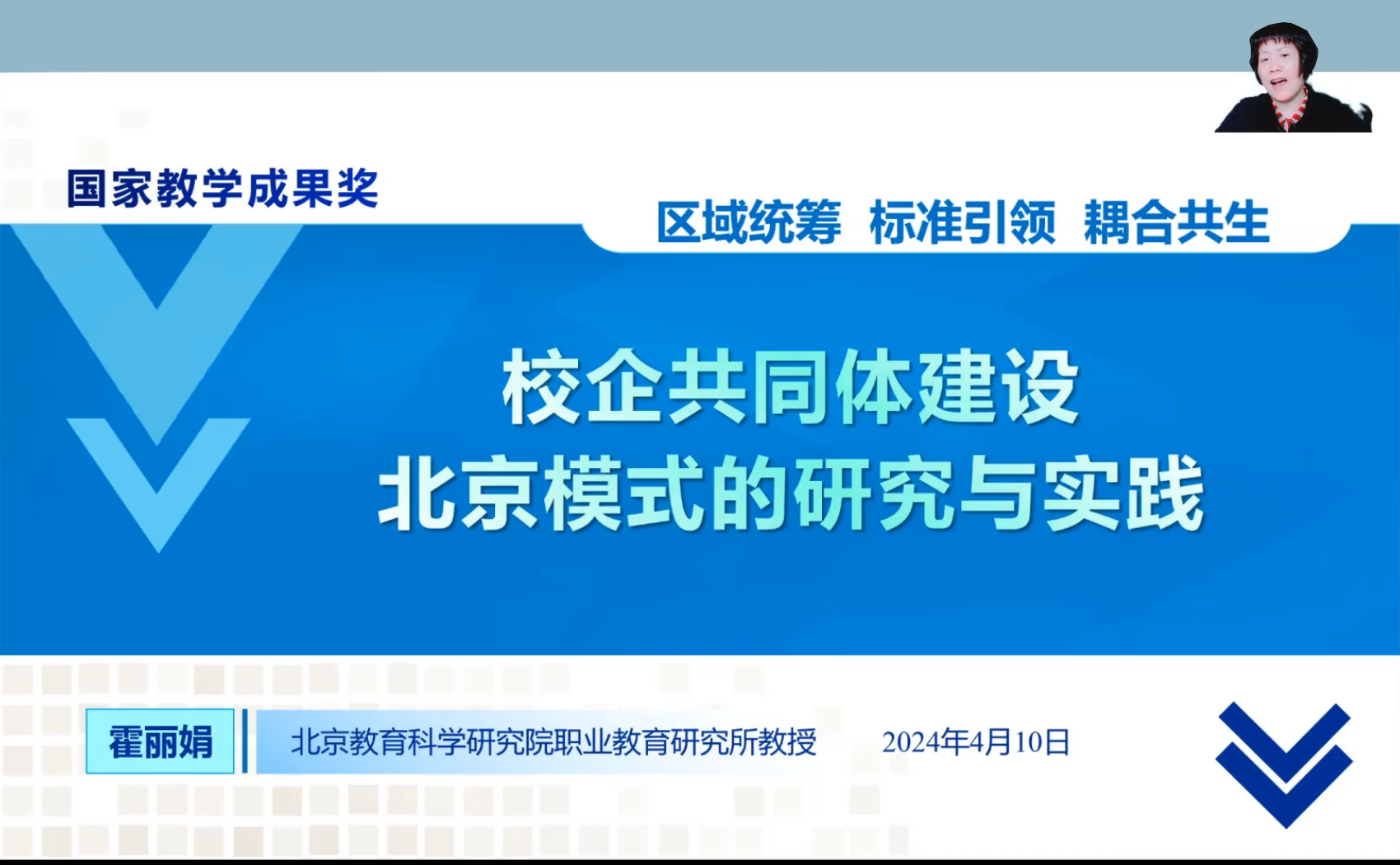 来自北京教育科学研究院职业教育研究所的霍丽娟教授,带来了题为《区域统筹 标准引领 耦合共生:校企共同体建设北京模式的研究与实践》的精彩分享。霍教授以其深厚的学术背景和丰富的实践经验,详尽地分析了新时期产教融合面临的机遇与挑战、分享了校企共同体建设北京模式的核心内涵等。