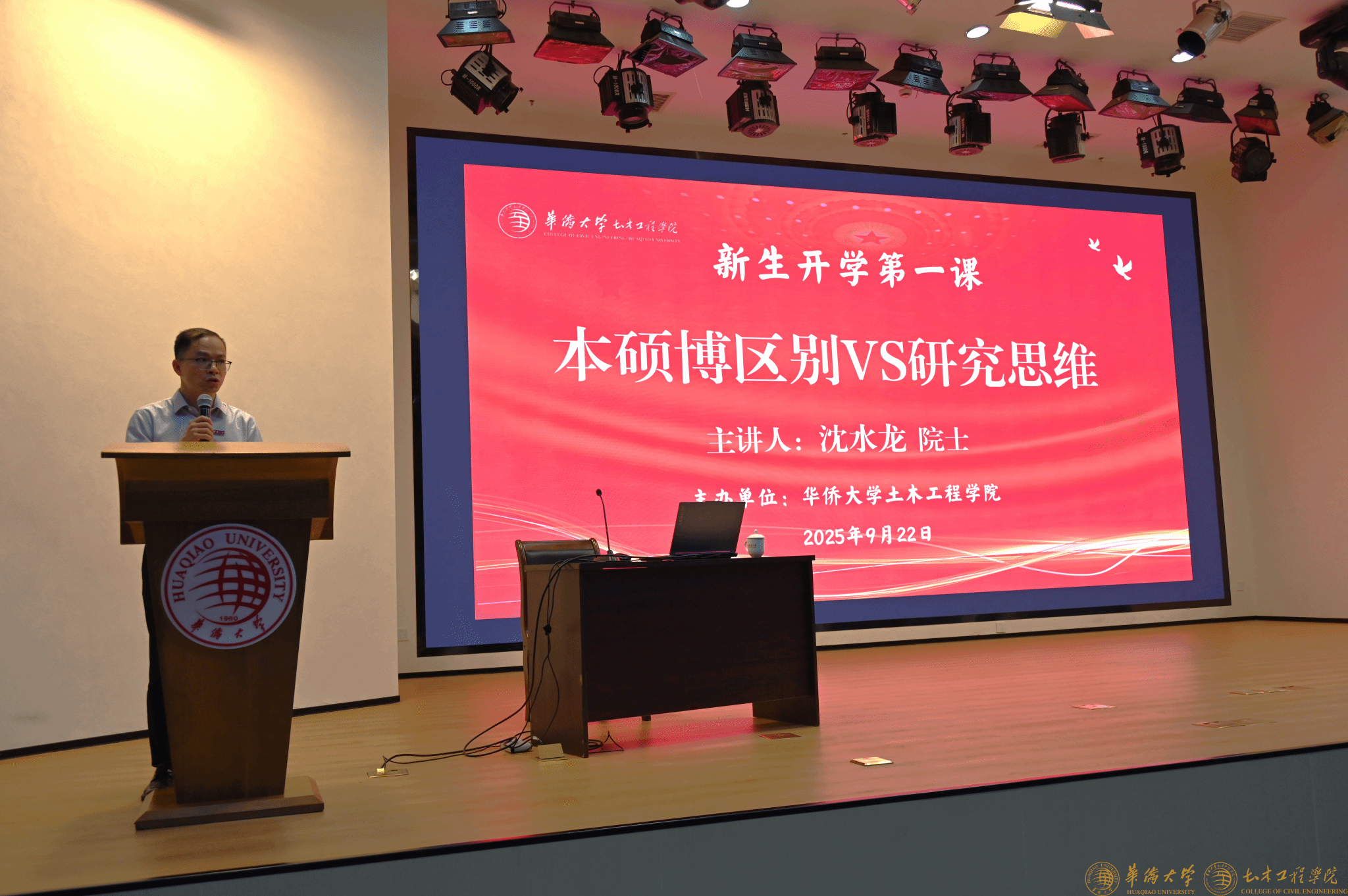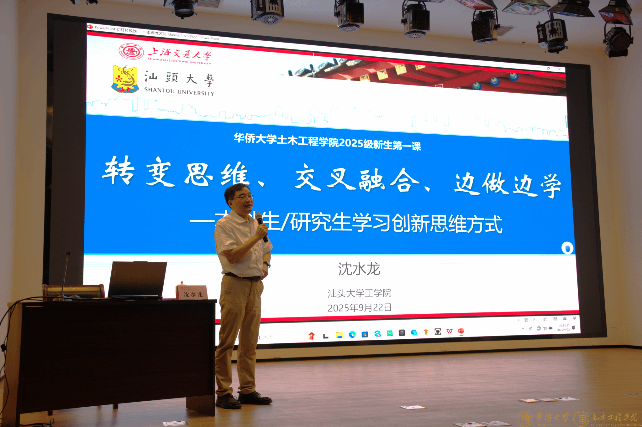9月22日上午,太阳成集团tyc122ccvip针对2025级全体新生开展 “新生开学第一课” 专题讲座,讲座于王源兴国际会议中心 G204 会议室举行。汕头大学工学院院长、欧洲科学院外籍院士沈水龙教授受邀主讲,学院领导、教师代表及 2025 级本研新生参加,副院长蔡奇鹏主持。